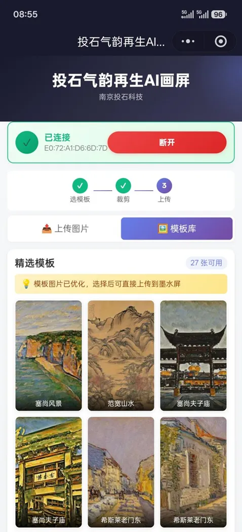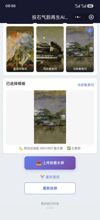 模板风格适配:模型提前对 27 种经典艺术风格进行学习训练,结合南京本地文化元素完成风格迁移优化,输出适配墨水屏显示的优化模板,保证画作在低分辨率墨水屏上依然清晰还原笔触与构图。