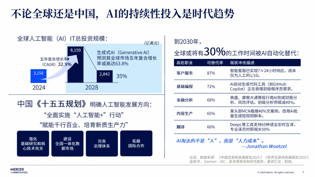 在人工智能技术飞速渗透各行各业的当下,AI不再是遥远的技术概念,而是深度融入企业运营、岗位设置与人才管理的核心要素。全球人工智能投资规模持续高速增长,我国“十五五”规划也明确将AI列为重点发展方向。到2030年,近30%的工作时间将被AI自动化替代,客户服务、技术编程、金融分析、内容生产、翻译等重复性高、人力成本密集的工作,正逐步由AI承接。