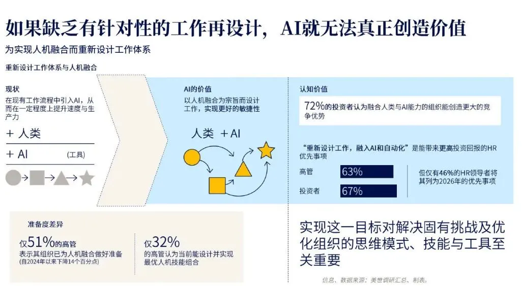 当前多数企业对AI的认知与应用仍停留在工具层面,缺乏对工作再设计的系统思考。对于HR与企业管理者而言,必须清醒认识到,AI时代的管理核心,是让技术与流程、岗位、人才形成协同,而非单纯推广AI工具。只有打破传统工作模式,围绕AI能力重新规划工作内容、协作方式与管控流程,才能让AI从提升个体效率的工具,转变为驱动企业高质量发展的核心动力。