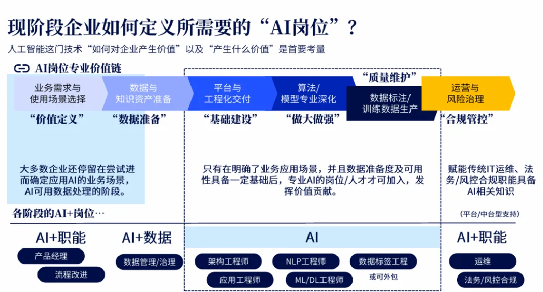 从企业实践来看,绝大多数企业尚未进入深度算法研发阶段,核心聚焦于场景识别与数据治理。基于这一现状,企业AI岗位可分为三大类型:一是AI+职能类岗位,如AI产品经理、AI流程改进专家,兼具业务能力与AI基础思维;二是AI+数据类岗位,如数据治理专员、数据管理师,承担数据梳理整合工作;三是专业AI技术岗,包括AI工程师、算法研发人员等核心技术岗位。同时,合规、风控、IT运维等传统岗位,也需要适配AI应用需求完成技能升级。
