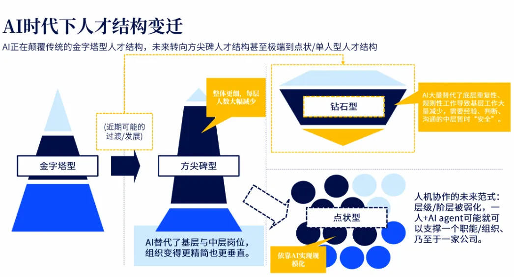 在组织形态层面,AI推动人才结构从传统金字塔型向方尖碑型、钻石型转变,基层重复性岗位被替代,中层人才更趋精简,组织架构逐步扁平化。未来甚至可能出现“点状组织”,单人搭配多个AI智能体即可完成部门级工作。面对这一变化,企业应重视具备AI素养的年轻基层人才,这类人群熟悉AI工具、思维灵活,能够快速适配新型工作模式。