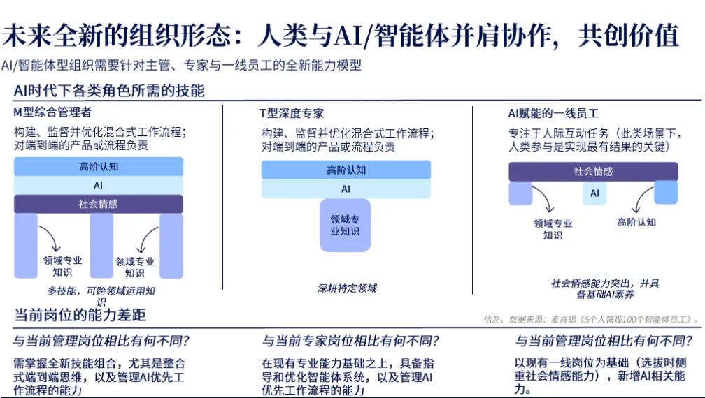 从人才能力要求来看,管理者需具备端到端思维与AI流程管理能力;专业人才需从I型专家转型为T型专家;一线员工需强化沟通协作等社会情感能力,弥补AI在人际交互中的短板。明确岗位价值链、合理设置岗位、匹配对应能力,才能构建适配人机协作的岗位体系。