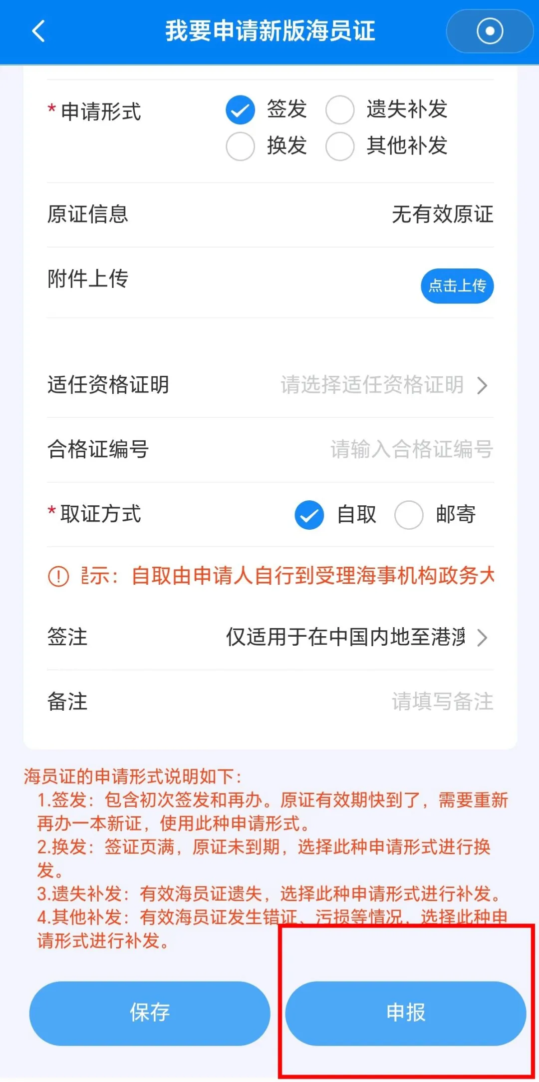 注意⚠️:海员证换证选择的申请形式是“签发”。“签发”包含初次签发和再办。“换发”指的是签证页满且原证未到期才是选择换发。