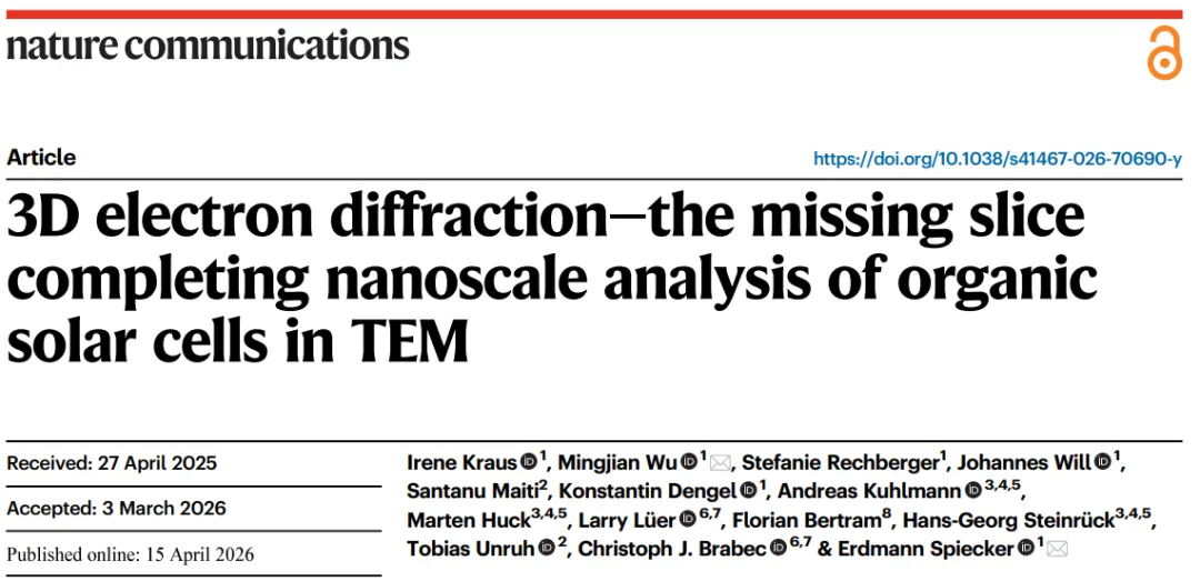 利用模型体异质结(BHJ)DRCN5T:PC71BM,3D ED 重现了从掠入射广角X射线散射(GIWAXS)获得的关键结构参数,包括晶格间距、相干长度(coherence lengths)和马赛克度(mosaicity),同时提供了真正的面内(in-plane)访问能力,并能在同一样品上与高分辨率成像、衍射成像和纳米光谱进行直接配准。将该方法应用于另一种典型的混合体系 P3HT:PC71BM,证明了该方法的通用性。强调了 3D ED 的变革潜力,特别是在分析对电子束敏感的有机薄膜方面。该方法实现了对有机太阳能电池的相关性结构表征,并为应用于其他纳米结构材料开辟了道路。相关内容以3D electron diffraction—the missing slice completing nanoscale analysis of organic solar cells in TEM为题目,发表在Nature communications杂志。