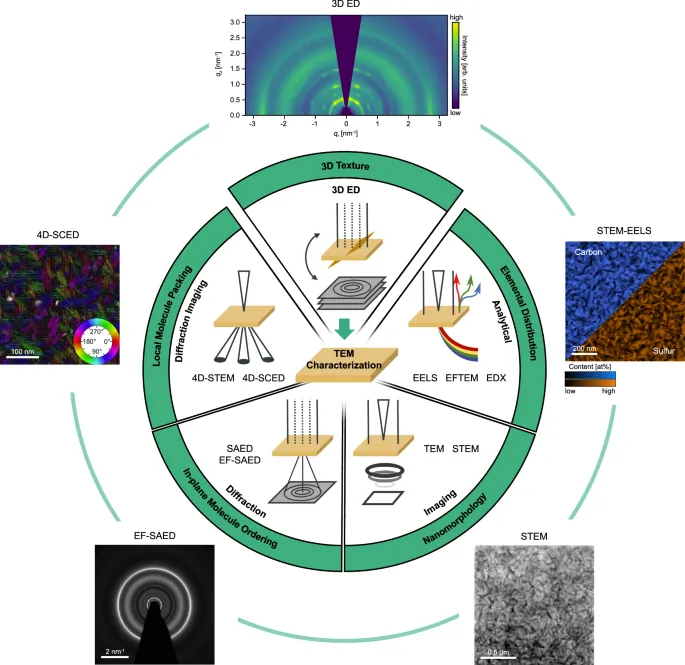图1. 三维电子衍射完善了透射电镜中有机半导体薄膜的结构表征。中心示意图展示了三维电子衍射如何集成到一台透射电镜仪器所提供的分析成像、衍射和衍射成像方法套件中。分析模态包括电子能量损失谱、能量过滤透射电镜和能量色散X射线光谱;成像包括常规透射电镜方法或扫描透射电镜;衍射包括选区电子衍射,可选能量过滤;衍射成像模态捕获二维实空间和二维倒易空间信息,例如四维扫描透射电镜或扫描共聚焦电子衍射。