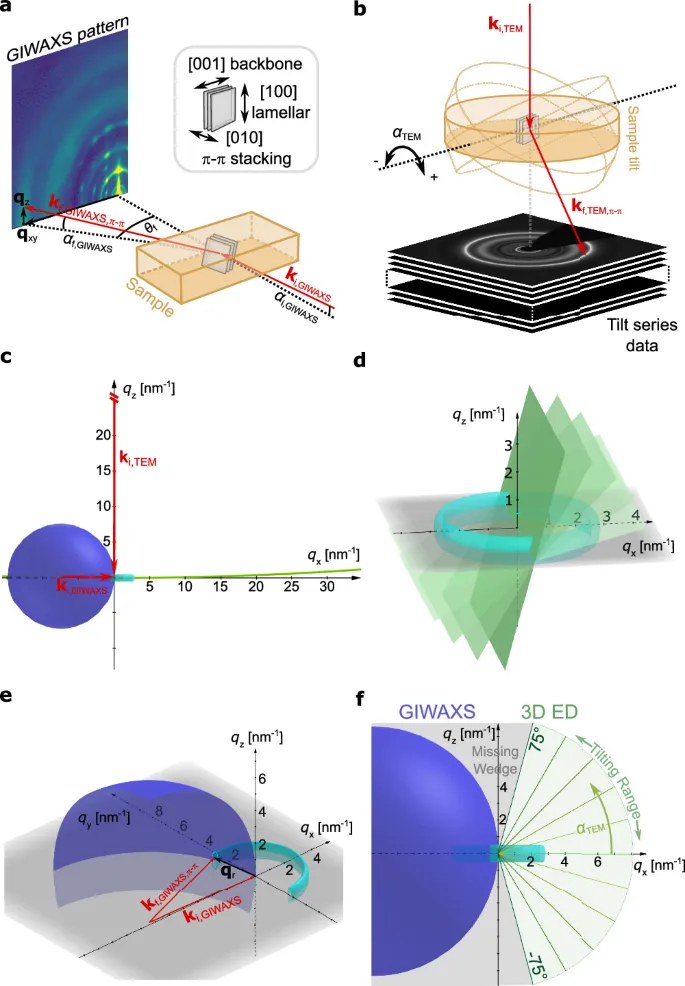 f 三维电子衍射和GIWAXS倒易空间采样的比较揭示了两种方法在典型实验条件下的缺失楔,量化了它们倒易空间采样几乎相等的(不)完整程度。