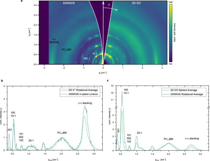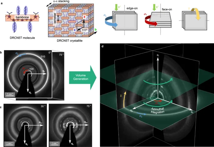 图4a比较了来自三维电子衍射和GIWAXS的qrz图,显示出匹配的衍射环和衍射点。良好的一致性证实了三维电子衍射能够提供与GIWAXS相当的结构信息。基于先前对GIWAXS数据的指标化,衍射点被归属为DRCNST微晶。在qz=2nm−1处的非晶晕来自PC71BM,而具有方位角段的尖锐环来自DRCNST微晶。补充图3显示了一个完全指标化的qrz图。每个数据集中缺失楔的不同形状反映了各自方法的局限性:三维电子衍射中有限的倾斜范围和GIWAXS中埃瓦尔德球的曲率。