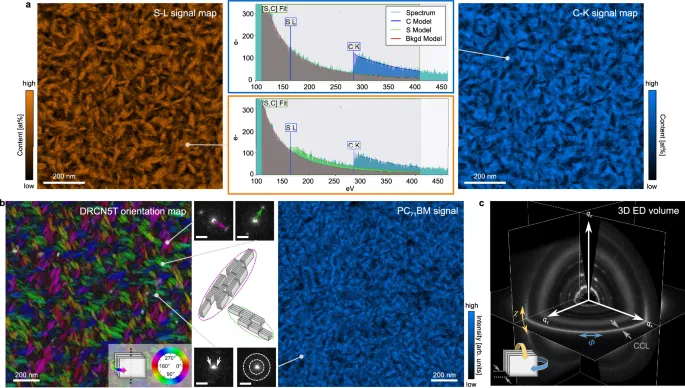 三维电子衍射的一个主要优势是其与现代透射电镜平台的集成,这有助于在衍射、成像和光谱方法之间无缝切换,以实现全面和关联的表征(见图1)。值得注意的是,这种关联的实空间/衍射方法允许我们将形态特征与分子堆积取向联系起来。图5显示了在透射电镜中从单个样品获取的关联数据集,包括STEM-EELS、4D-SCED和3D ED。STEM-EELS提供元素分布图,并通过化学成分揭示给体-受体相分离:小分子含有更多的硫,而富勒烯受体富含碳。通过基于模型的拟合获得的相应S-L和C-K图,解析了叶状给体畴区(见图5a,关于评估细节见补充说明)。此外,4D-SCED分析通过面内π-π堆积和(100)峰,揭示了相对于畴区形态的边朝上和面朝上微晶的存在和取向(见图5b)。π-π堆积取向图显示,叶状区域由边朝上取向的DRCNST微晶组成,其π-π堆积面法线沿着畴区的短轴排列,如插图所示。相比之下,较小或更圆形的畴区主要包含更多面朝上取向的微晶。畴区形状与分子堆积(边朝上 vs. 面朝上)之间的这种特定关联意义重大;它表明溶剂蒸汽退火诱导了晶体畴区与介观相分离结构的排列。这种排列可以影响电荷传输路径:边朝上取向的畴区(π-π堆积方向在面内)可能促进更远距离的面内传输,而面朝上畴区促进垂直传输。此外,PC71BM也对4D-SCED衍射信号有贡献,表现为非晶晕,正如在SAED图案中已经讨论过的那样。通过应用环形虚拟探测器来映射相应的信号,从而通过底层衍射数据揭示受体分布,这是通过STEM-EELS中的分析信息揭示受体分布的另一种方式。
