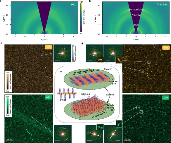 a, c 未处理样品的结果;b, d 退火10分钟样品的结果。a, b 三维电子衍射qxz图。退火后,(100)环变锐利,显示出强烈的面内和面外峰,表明在这两个取向上具有更高的结晶度和更大的微晶尺寸。c, d 通过分析4D-SCED数据中的层状堆积(100)和 π-π堆积(010)衍射信号,分别以虚拟暗场图像揭示的面朝上和边朝上畴区。展示了从2×2探针像素区域提取的几个原始衍射图案(强度以乘方标度显示),用以说明信号水平。e 示意图,展示了热退火后边朝上畴区沿 π-π堆积方向伸长的结构模型。