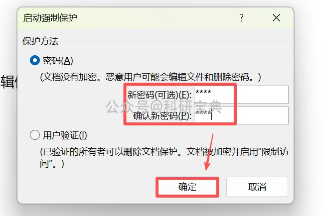 3、在弹出框中输入【强制保护密码】,点击【确定】;