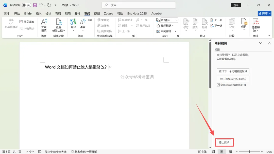 5、如果要取消保护,同样点击【审阅】-【保护】-【限制编辑】-【停止保护】;