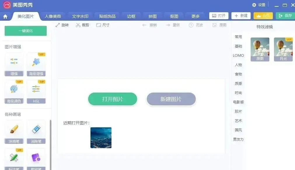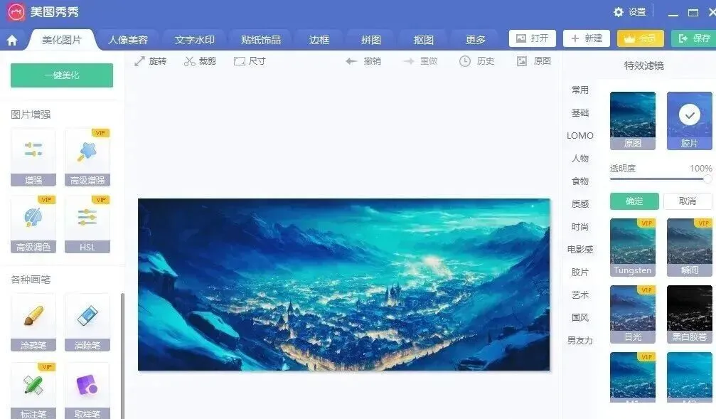 1、会员专属滤镜。支持月光、LOMO、胶片等多种风格滤镜。