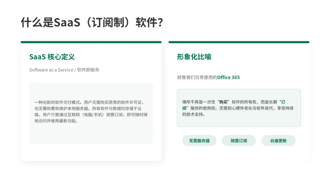 很多律所管理者可能听过SaaS,但对其核心逻辑并不了解,其实简单来说,SaaS(软件即服务)就是无需律所自行购买服务器、无需投入大量资金进行开发,而是通过“按需付费”的订阅模式,在线使用专业软件服务的一种形式。
