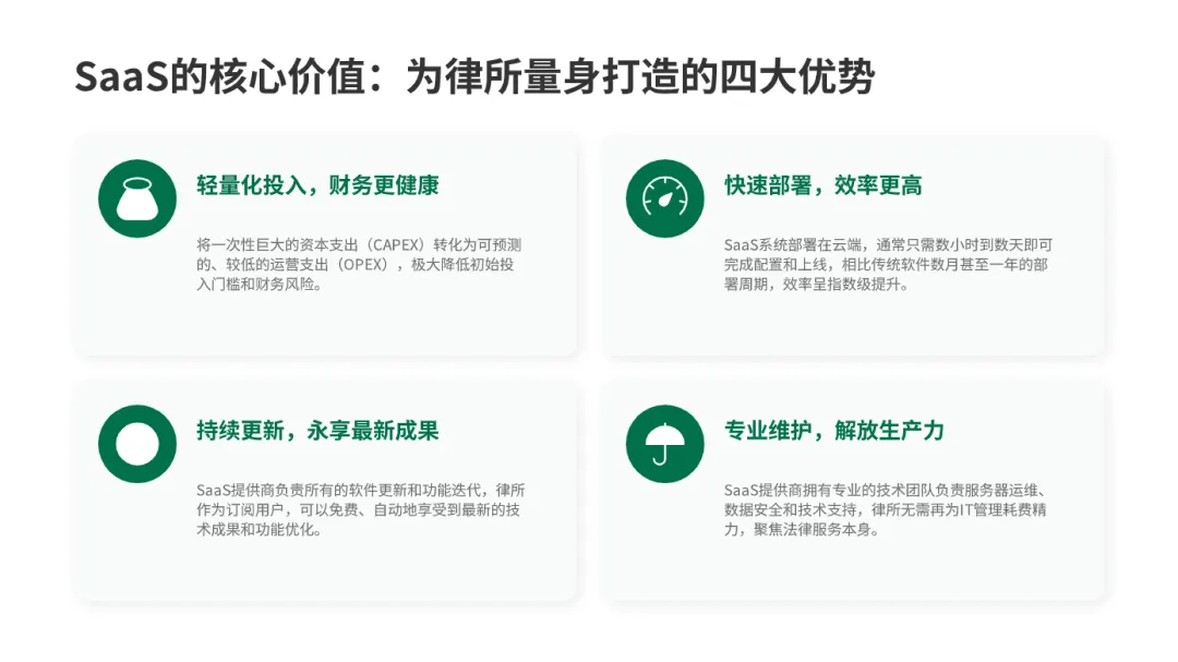 中国律所的发展现状、管理模式,与国外律所存在显著差异,而SaaS(订阅制)软件的核心优势,恰好精准匹配了中国律所的核心痛点。具体来说,主要有三点原因: