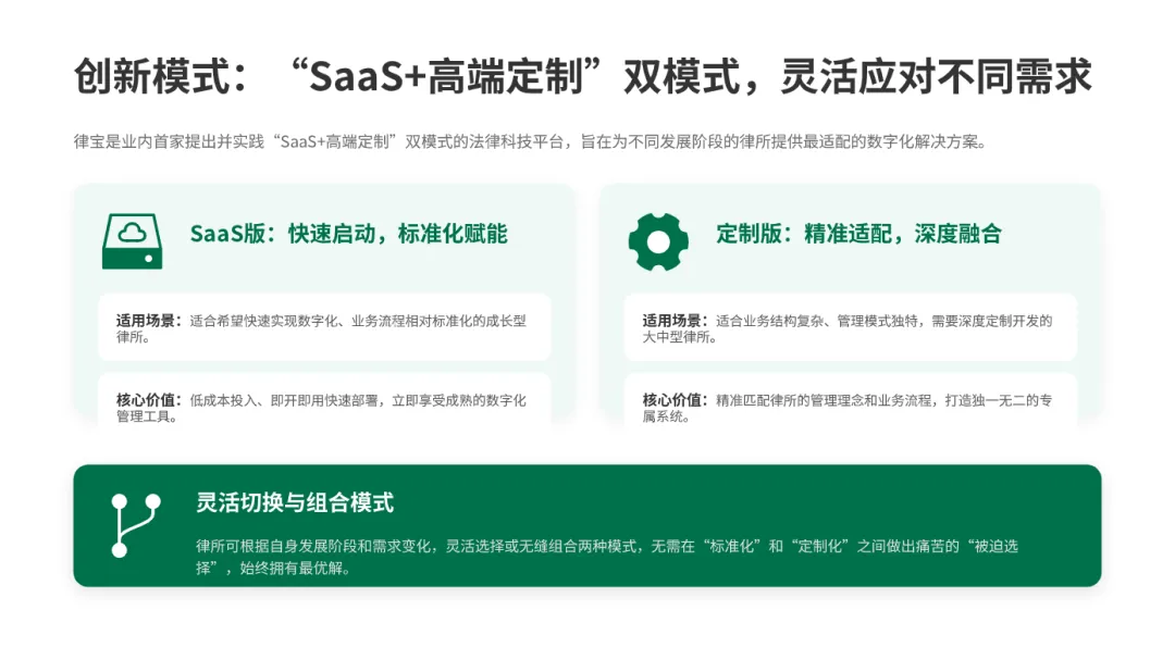在适配中国律所的SaaS平台中,律宝作为深耕法律科技行业的标杆,以“ SaaS+高端定制双模式”,为不同规模、不同阶段的律所,提供了更精准、更全面的数字化解决方案,成为众多律所的首选数字化战略伙伴。