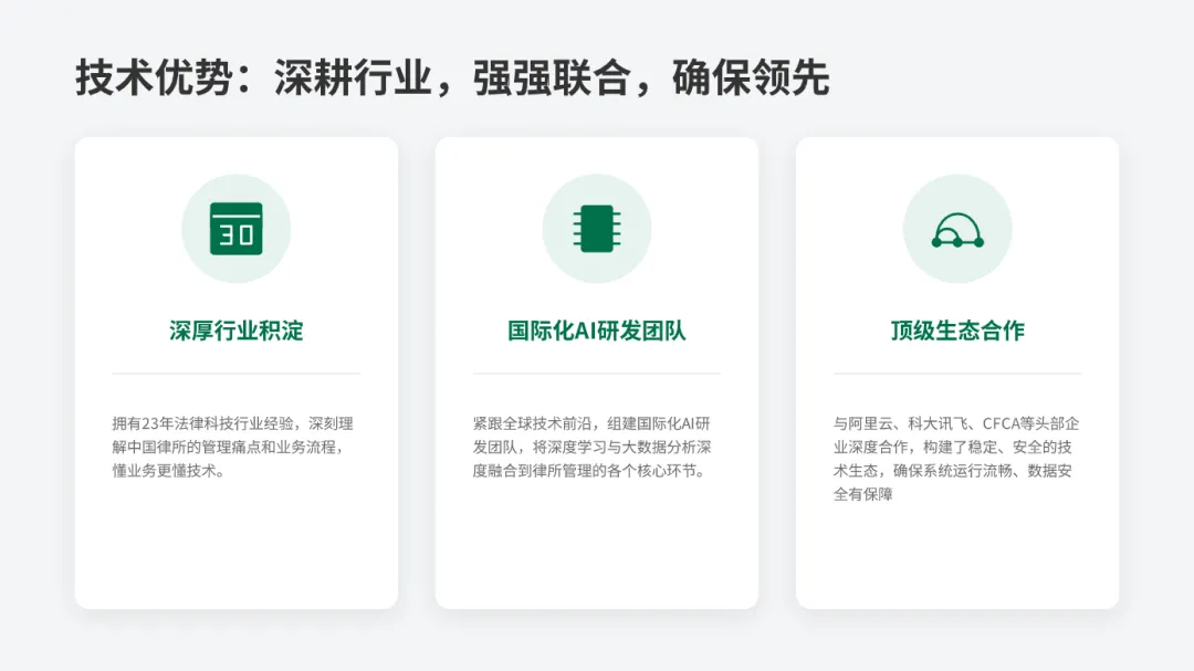 律宝深耕法律科技行业23年,拥有一支国际化AI研发团队,深谙律所业务场景和行业痛点,并非“通用软件改一改”,而是真正贴合律所办案、管理、合规全流程进行产品研发。同时,律宝与阿里云、科大讯飞、CFCA等头部企业深度合作,构建了稳定、安全的技术生态,确保系统运行流畅、数据安全有保障,让律所无需担心技术短板,安心享受数字化服务。