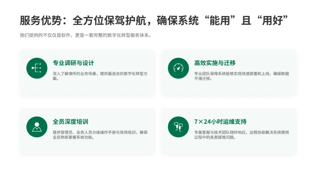 律宝深知律所管理者的核心诉求是“省心、高效”,因此提供全方位的服务支持,彻底打消律所的后顾之忧。从前期的专业调研与设计,深入了解律所需求,制定贴合实际的数字化解决方案;到中期的高效实施与数据迁移,确保系统快速上线、平稳过渡;再到后期的全面培训与指导,帮助律所全员快速上手,同时配备7*24小时运维支持,无论遇到任何技术问题,都能及时响应、快速解决,让律所数字化转型全程无忧。