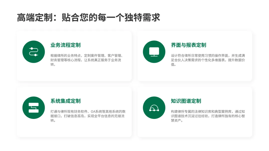 前期咨询,免费为律所诊断管理痛点,提供初步数字化转型建议;