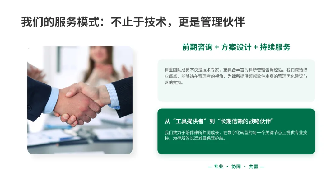 更重要的是,律宝的团队成员均具备丰富的律所管理咨询经验,深谙中国律所的管理痛点和发展需求,不是单纯的“销售软件”,而是真正值得律所信赖的管理伙伴。
