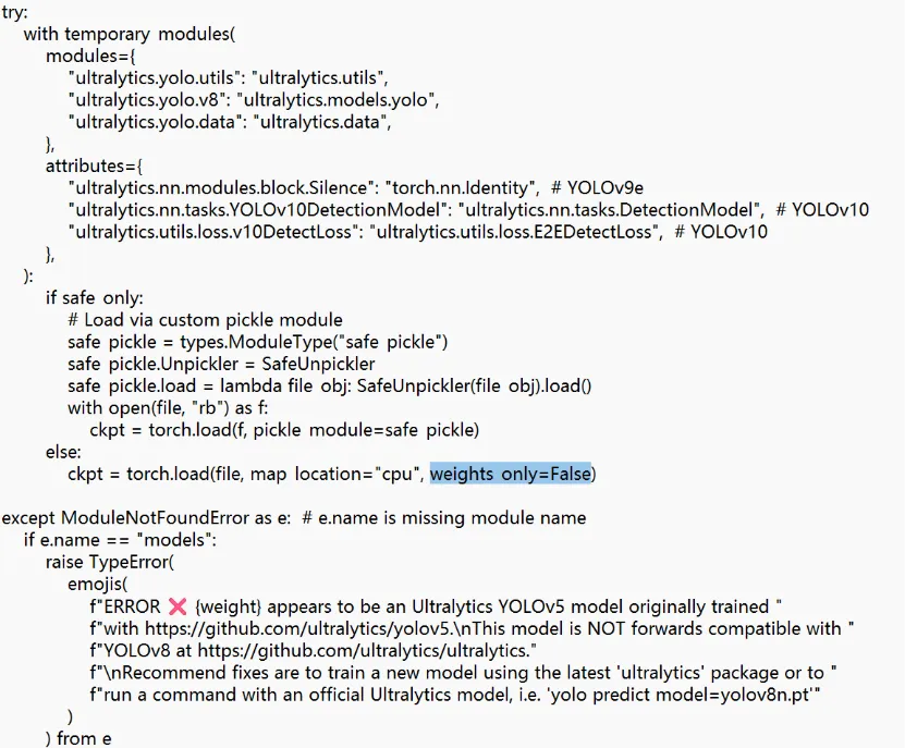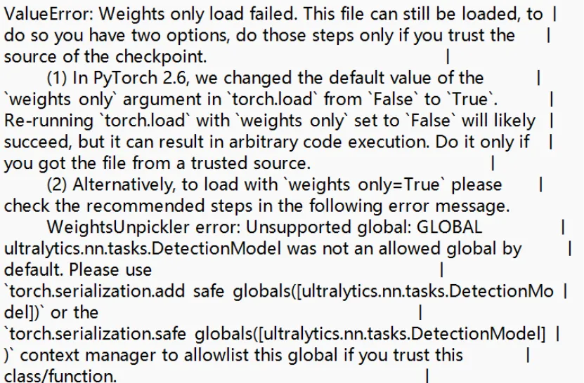 其中有一个解决方案比较简单:新版本工具代码中weight_only参数的值默认是True。face_yolov8n.pt模型文件在加载的时候包含了不被允许的对象,所以出现了无法加载的问题。想要加载这个模型文件可以把weight_only参数设置为False,但是这样会面临安全风险。