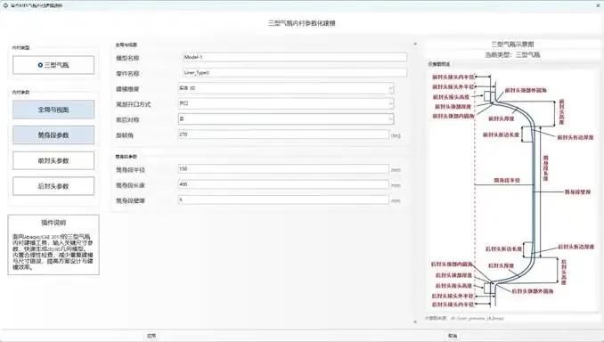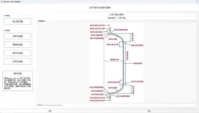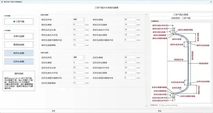 该插件将气瓶内衬的主要结构参数集中在统一界面中进行管理,支持筒身段、前封头、后封头、接头及过渡圆角等核心尺寸的参数化输入,适用于三型气瓶内衬结构的方案设计、模型快速搭建、尺寸迭代与前处理准备。