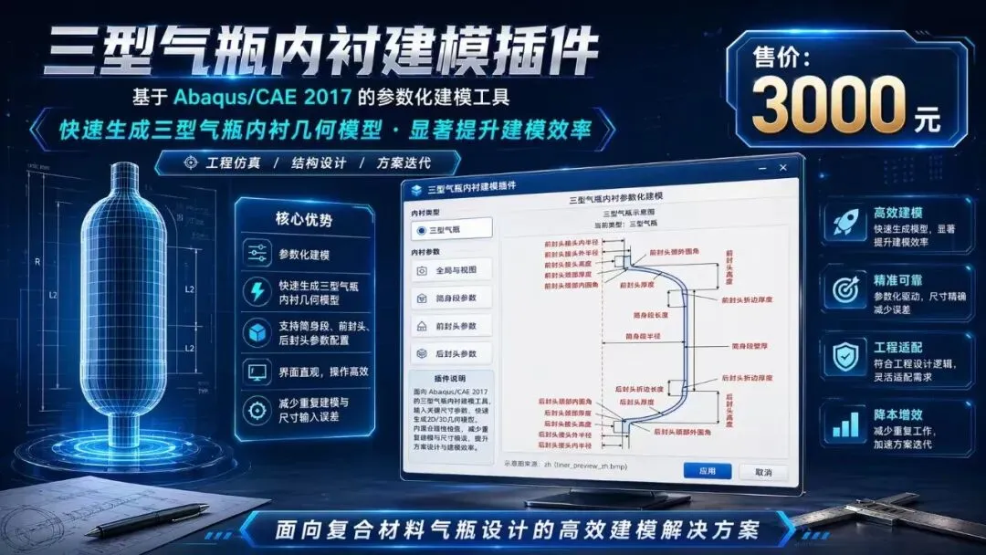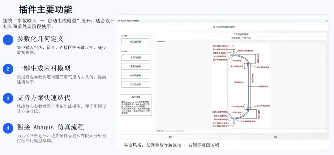 三型气瓶内衬参数化建模插件将原本依赖手工操作的复杂建模过程,转化为清晰、直观、可重复的参数输入过程。它不仅能够提高建模效率,还能减少几何错误、提升设计迭代速度,并为 Abaqus 分析前处理提供更加稳定、高效的几何建模支持。