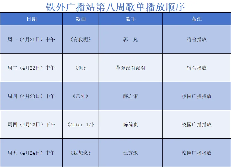 广播站|第8周歌单回顾&第9周停播说明 铁 外 点 歌 台 ★ 歌 单 回 顾 ★ 因有考试安排,广播站第九周停播。 祝大家考试顺利 考的全会,蒙的全对! 扫码关注“铁外团学”公众号 了解铁外最新消息以及活动