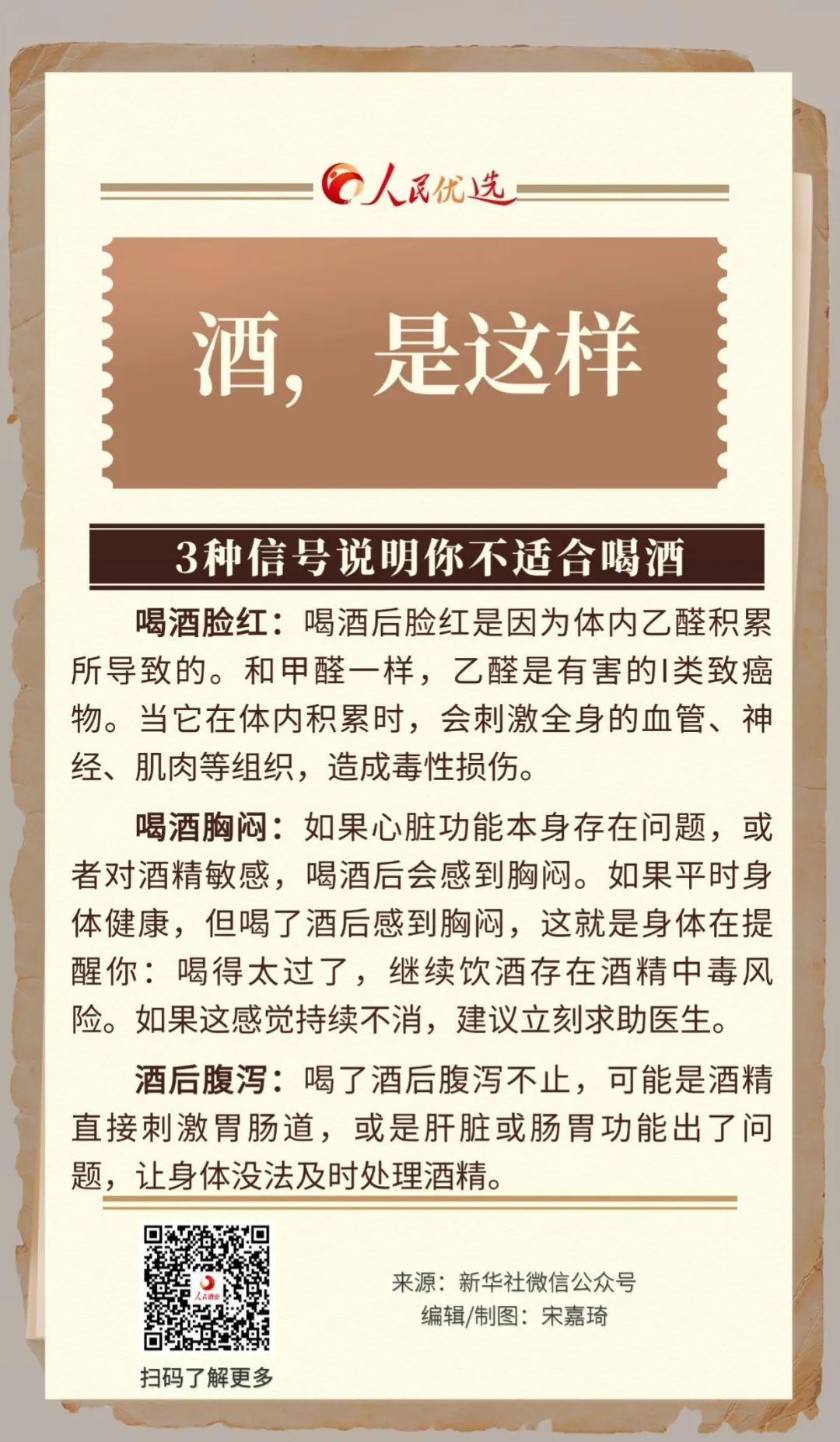 3种信号说明你不适合喝酒 酒精,虽然能带来一时的欢乐,但如果身体状况不允许,那可就要小心了。出现下面3个不适合喝酒的信号,千万别忽视了! 责编丨周璨晨 编辑丨王治军 来源丨人民优选(编辑/制图:宋嘉琦) 推荐阅读 春日踏青,这些毒虫也需警惕! 谁能帮他戴上头盔? “春捂”要“捂”哪里? 近期热门视频 更多精彩视频,尽在人民优选视频号 欢迎关注~
