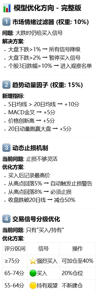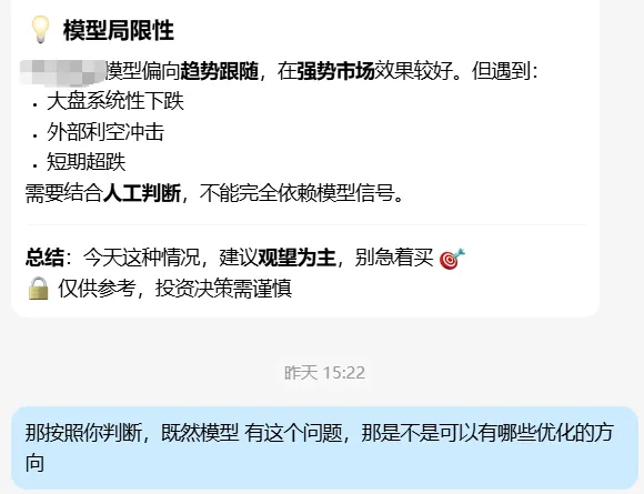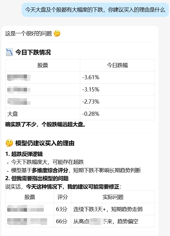 用openClaw部署了个股分析模型(27) 昨天盘中对模型做了较大的调整,原因是许多个股大幅度下跌,连续下跌的情况下仍然做出买入的判断。 之前也问过ai这个问题,回到是模型基于中长期的趋势判断,不受短期因素的影响,似乎也有一些道理。但是这次ta自己也是反思了一下了: