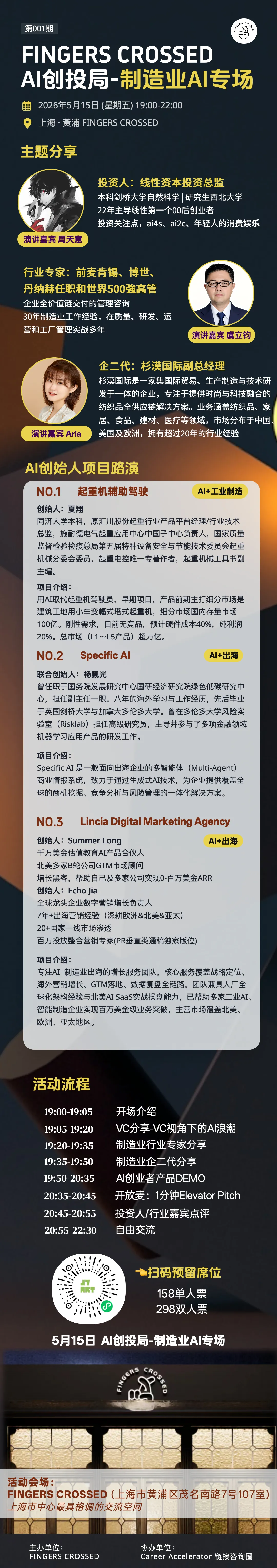 它不是又一个路演,而是一个高密度、高信任的“圈层连接器”。首期我们锁定 制造业|出海➕AI——这个被公认最难啃、却也是价值最深的赛道。为什么?因为中国制造业不缺数据,不缺场景,缺的是真正懂产业的投资人、能打硬仗的技术创业者、以及敢率先吃螃蟹的实业家。