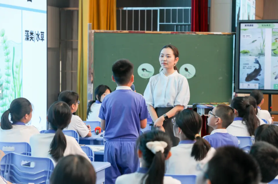 杨老师以破案找凶手为情境预设,引导学生探究藻类、水草与水生生物的关系。课堂上,学生积极举手发言,在师生互动中梳理食物链逻辑,通过具象化的教学情境,将抽象的生态概念转化为可观察、可讨论的真实问题。