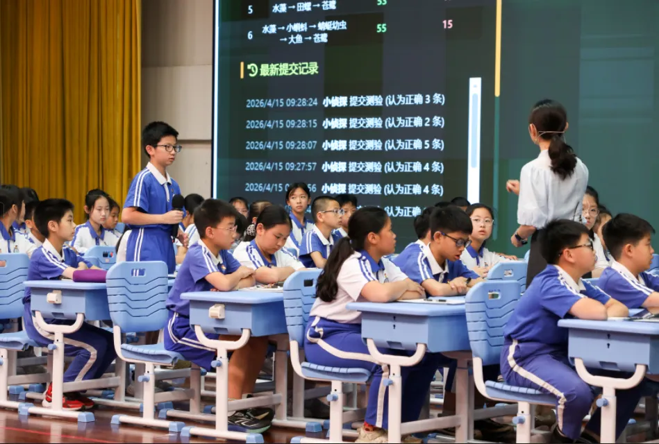 华中科技大学硕士、我校新锐教师杨思宇老师,带来了一节令人耳目一新的五年级课例。她巧妙运用AI技术,将抽象的生态关系可视化、互动化,让学生在技术的辅助下深度探究。