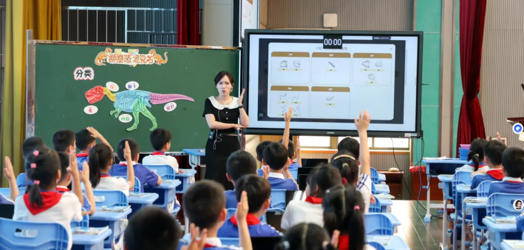 课堂上,老师以恐龙骨骼模型为载体,引导二年级学生认识恐龙身体结构,通过AI互动平台发布任务,孩子们踊跃举手、积极参与,在轻松有趣的互动中掌握了科学分类的方法。黑板上的恐龙骨架图示,配合大屏幕的分类任务,让抽象的古生物知识变得直观易懂。