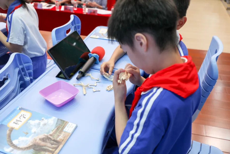 课堂实践环节中,学生们专注地拼接恐龙“化石”模型,在动手操作中探索骨骼结构的奥秘。他们一边对照课本知识,一边调整骨骼位置,在一次次尝试中还原恐龙形态,将科学探究精神融入指尖的实践中,真正实现了“玩中学、做中学”。