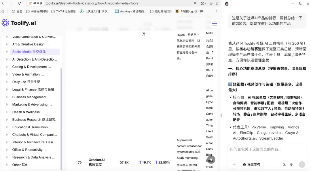 我通过toolify先看了一下海外社媒相关的Ai工具,排名前200的都在做什么。