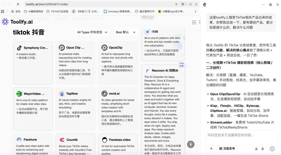 我又在toolify搜索了TikTok相关工具,同样让豆包给我分析一下,都是一些什么产品。