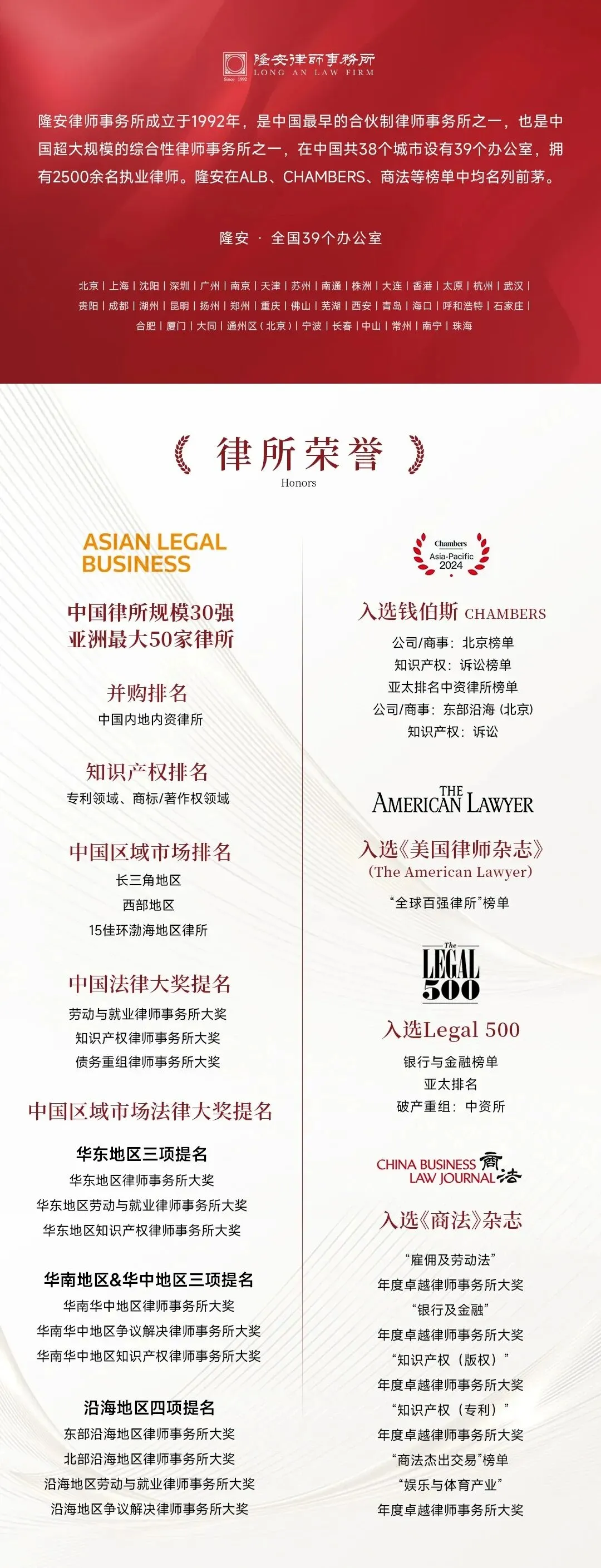 截至目前,隆安知产团队代理的专利商标申请逾2万件,知产诉讼代理经验1万多件。隆安代理的知产案件每年都有被入选各级法院、各专业团体协会及评估机构评定的知识产权十大案件、典型案例等,彰显了隆安作为一流大所的品牌影响力。