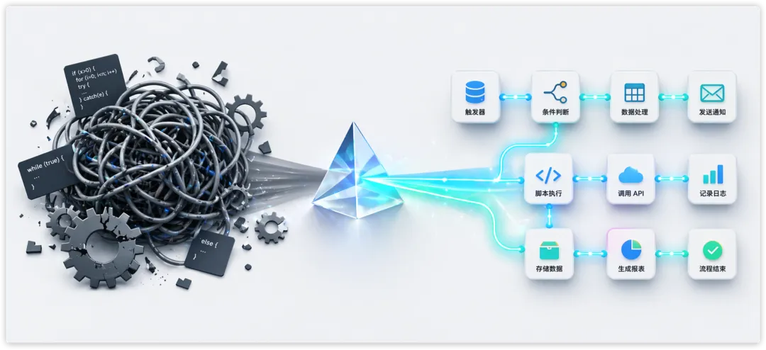 当自动化任务只用代码编写,而且由部门里四五个人轮流维护时,每次人员变动,知识传递都是一种损耗。新人得读前人代码、理解当年的业务假设、猜测那个被注释掉的奇怪分支到底还用不用。这种隐性认知成本,随复杂度指数上升。