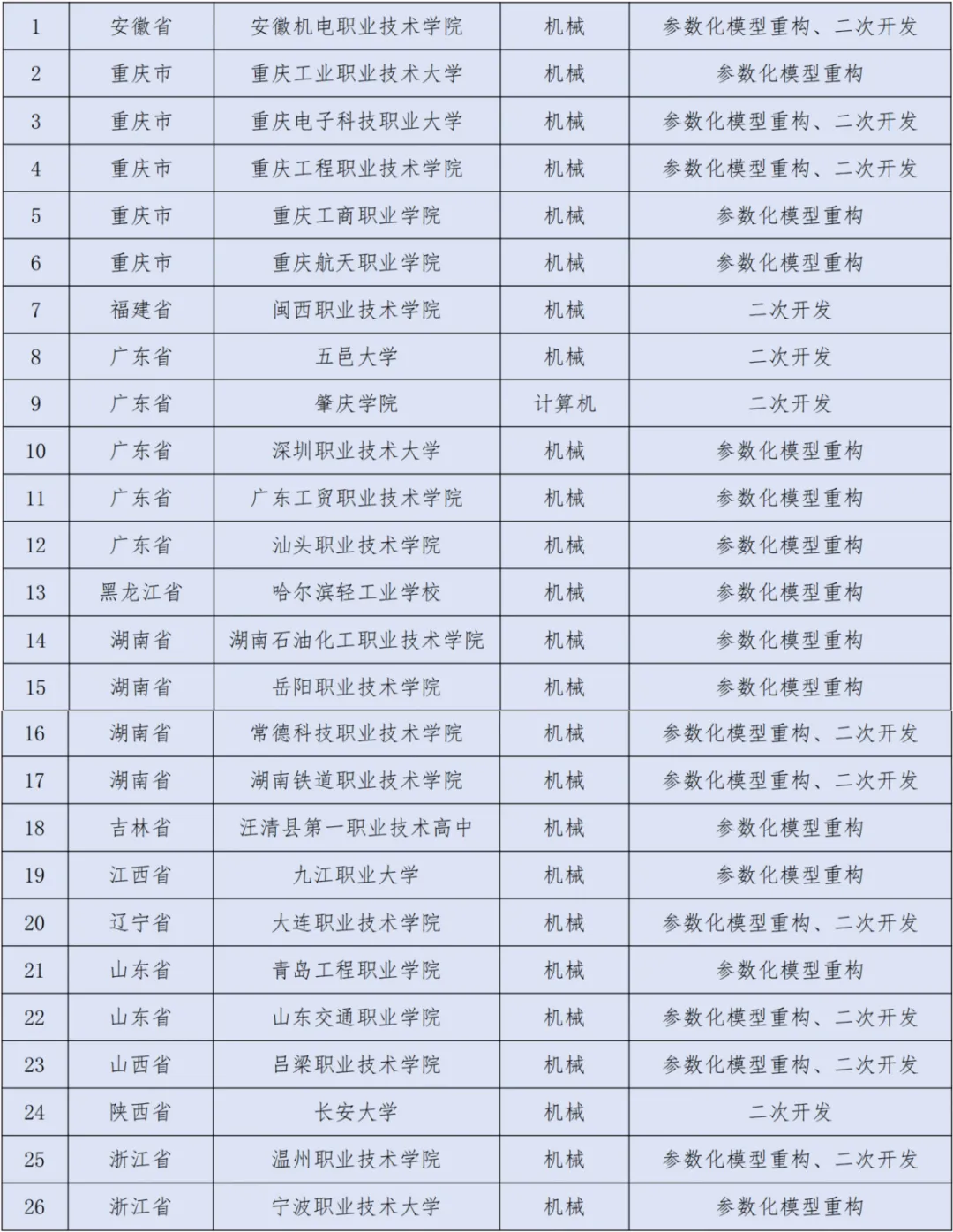 为深入贯彻产教融合发展战略,推动国产工业软件进课堂、进实训室,广州中望龙腾软件股份有限公司面向全国院校开展“国产工业软件参数化重构及中试基地建设”合作院校征集工作。经院校报名、资格审查、线上考核等环节,现将通过评审的入选院校名单予以公示。
