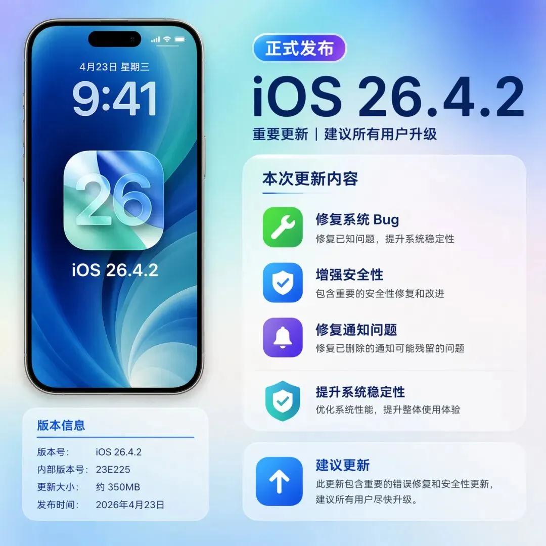 iOS 26.4.2:苹果连夜推送的”终极补丁”,核心是修复CVE-2026-28950通知残留漏洞——被标记删除的通知可能意外残留在设备上,存在隐私泄露风险。但更让果粉们惊喜的是,这个版本还顺带把续航、信号、流畅度、音质都做了显著优化,被很多用户称为”养老版本”。