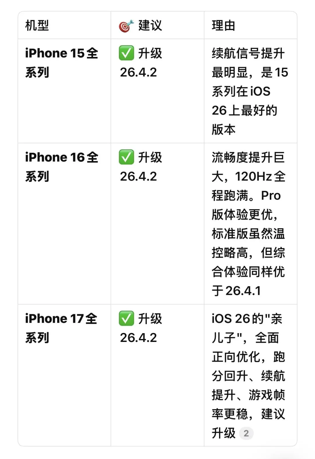最近后台被问得最多的问题,就是iOS 26.4、26.4.1和最新发布的26.4.2这三个版本到底选哪个。这三个版本的版本号只差了小数点最后一位,但体验差距却相当大。今天,我就把这三个版本在iPhone 15、16、17三代机型上的续航、信号、流畅度表现,掰开揉碎了讲清楚。