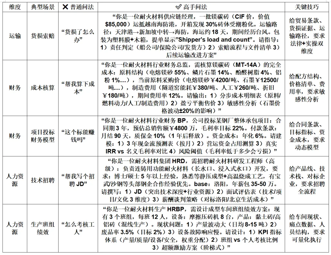 结合耐火材料行业特点,从技术、生产、业务、销售、运输、财务、人力资源七大维度整理的提问策略表格: