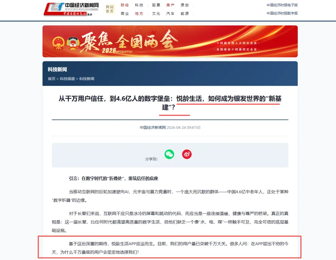 近日,悦享家直播应用APP悦龄生活因其在服务中老年群体数字化生活方面的卓越表现,获得了权威媒体-中国经济新闻网的关注与报道。