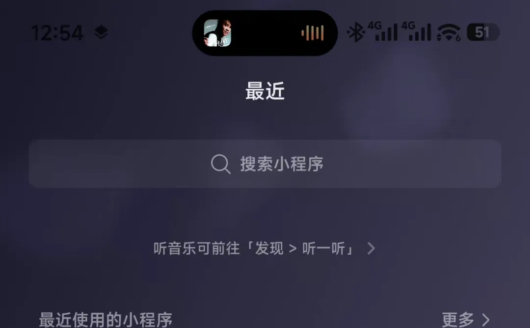 本次的新版本中下拉目前只出现了小程序了,如果你要听音乐就需要前往发现 → 听一听中查看。
