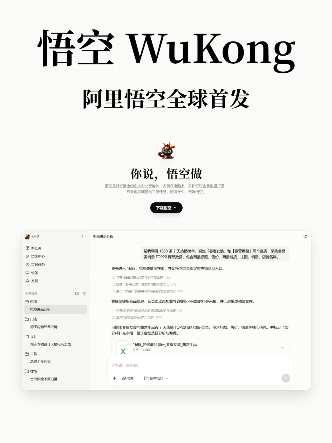 打开悟空的官网,主 Slogan 只有五个字:“你说,悟空做”。