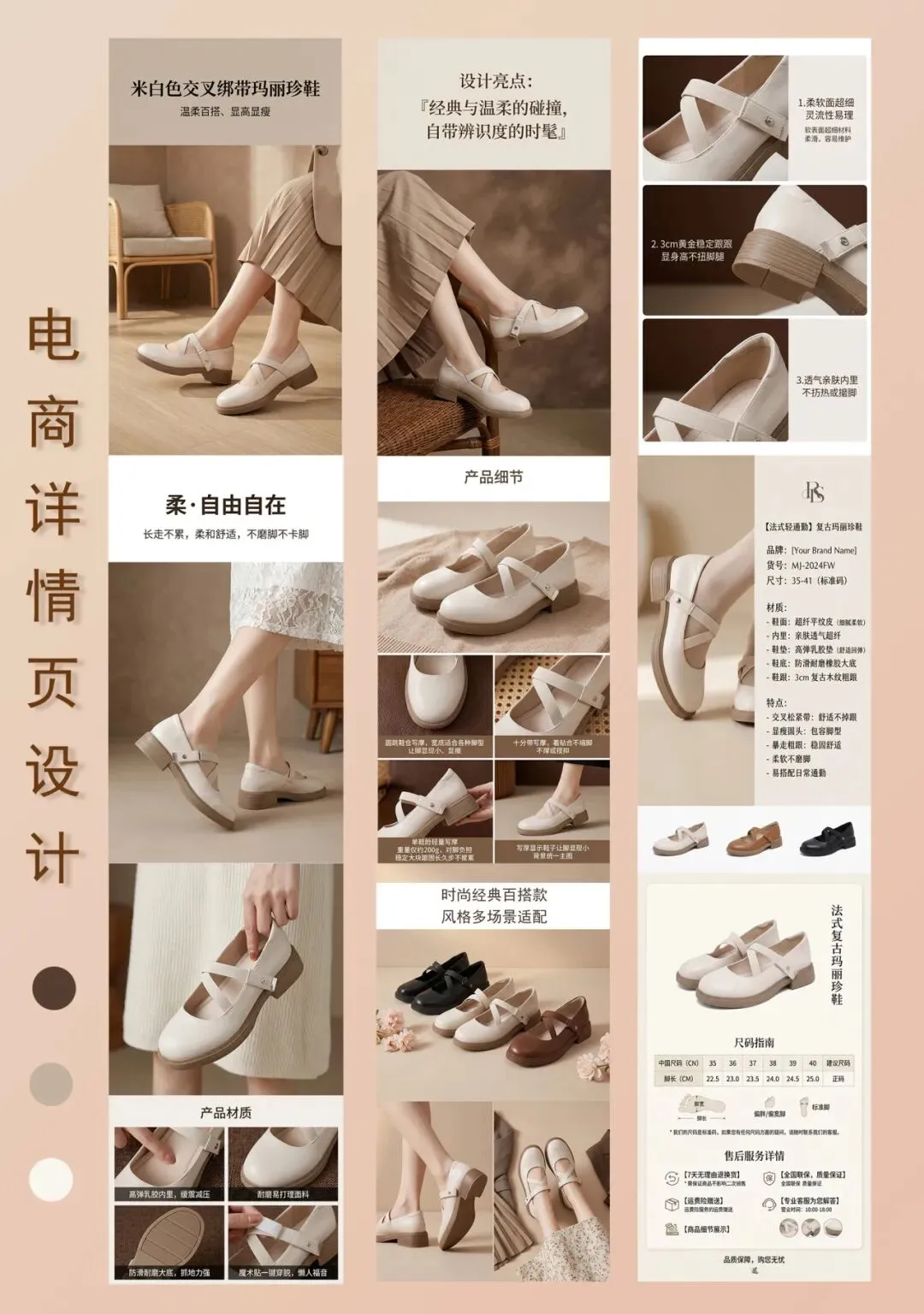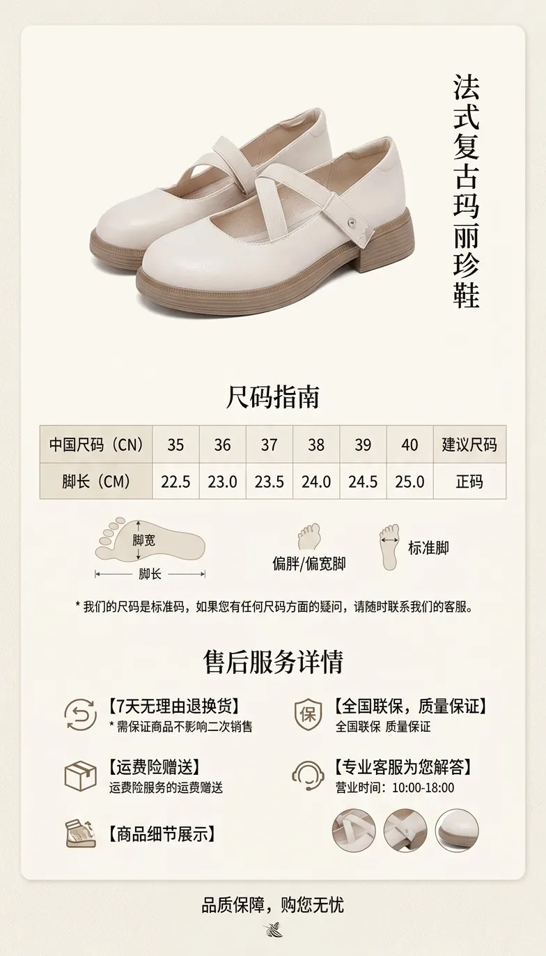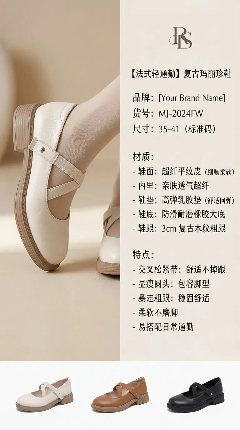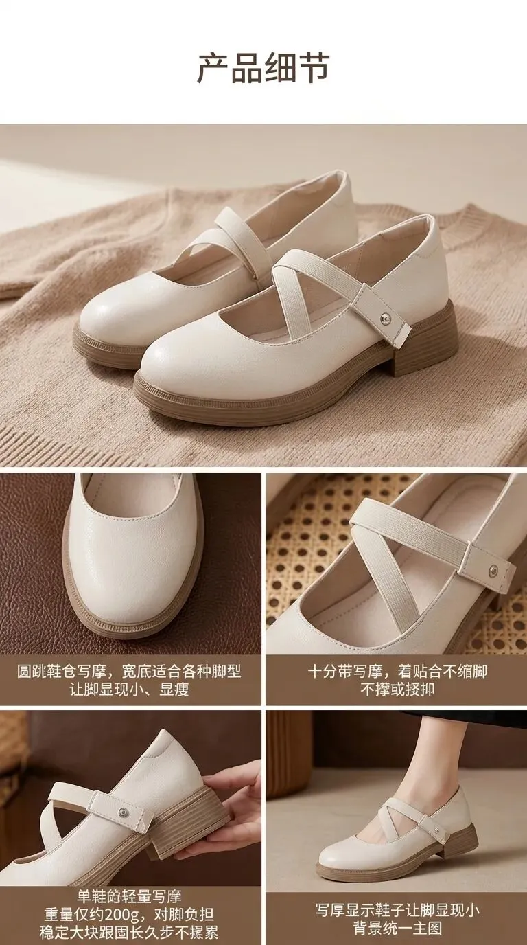 画面:竖版9:16构图,画面左半部分是米白色玛丽珍鞋的正面+侧面双角度展示,右半部分预留大面积空白排版区域,用于添加产品参数、品牌、货号、尺码、材质等信息,底部搭配多色鞋子小图展示(奶茶色、焦糖色、暗黑色),背景是极简纯白色肌理,柔光顶光,画面干净整洁,无多余杂物。