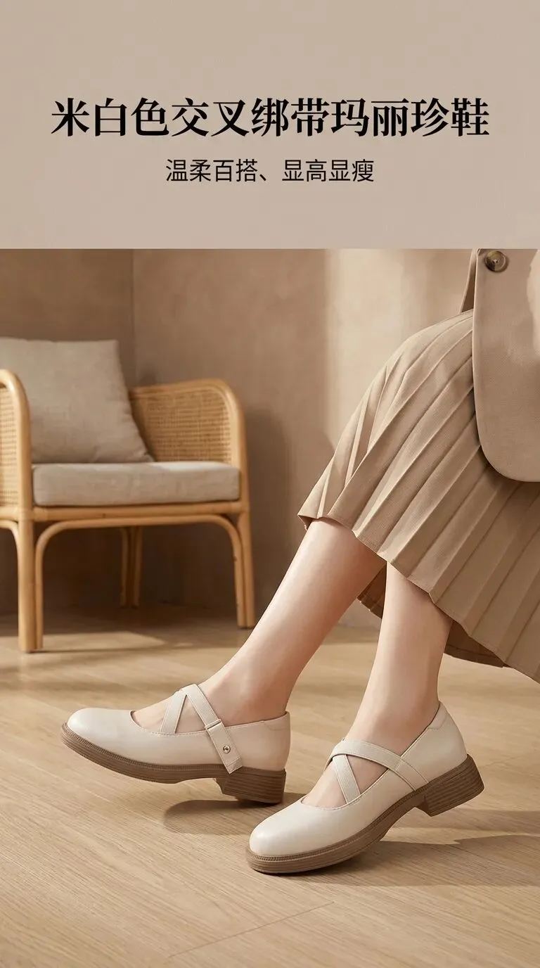 画面:竖版9:16构图,画面上半部分预留大标题空白排版区域,下半部分真人局部上脚特写,仅露脚踝和小腿,穿着米白色玛丽珍鞋,搭配米黄色百褶半身裙+同色系西装外套,站在浅木色地板上,背景是极简奶咖色肌理墙面,搭配藤编椅一角,暖调侧逆光勾勒鞋面皮质光泽,突出产品温柔高级的核心质感,画面干净不拥挤。