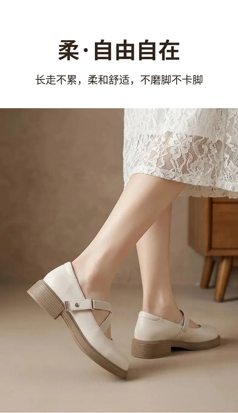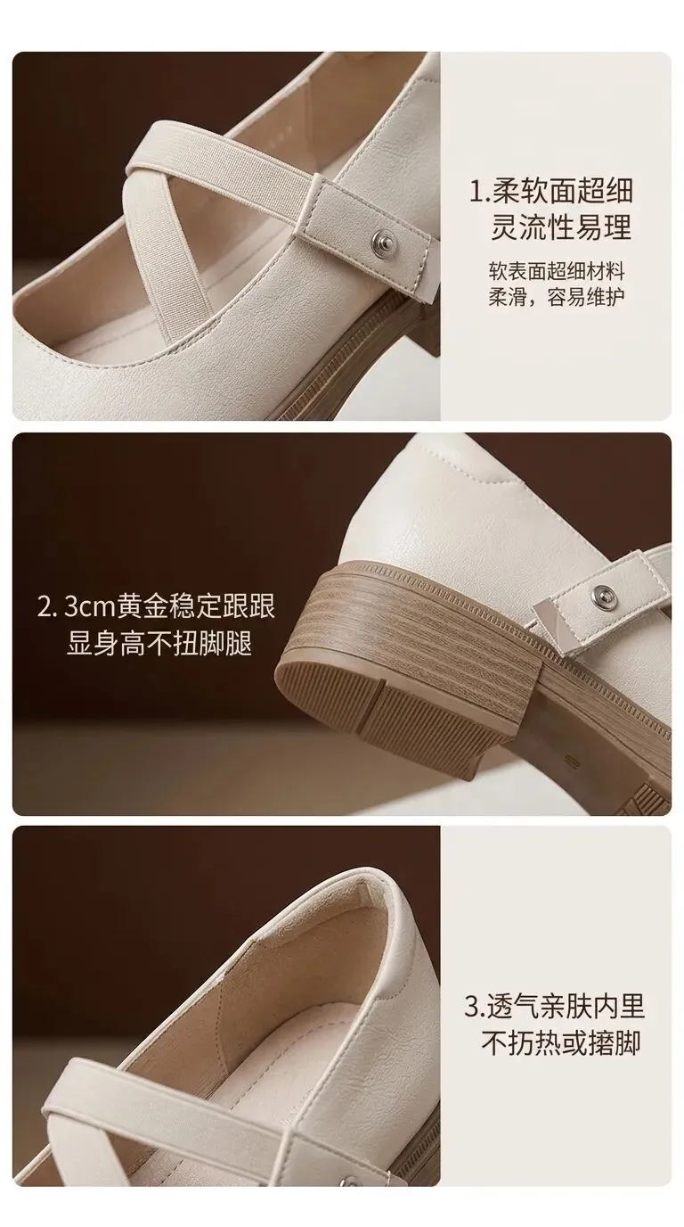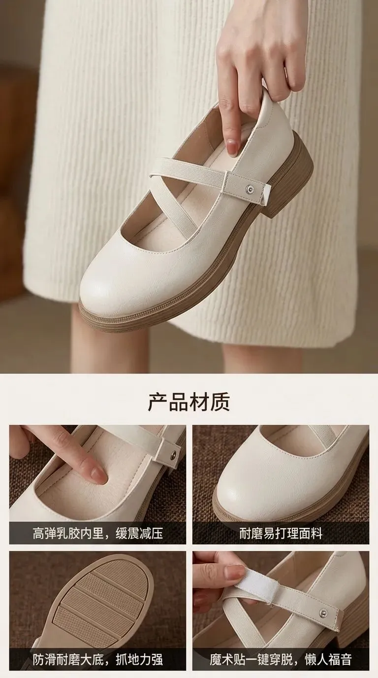 主体:女士米白色复古玛丽珍单鞋,圆头浅口设计,双条交叉弹力绑带+银色金属按扣魔术贴固定,3cm浅棕色木纹粗跟厚底,防滑耐磨橡胶大底,软面细腻平纹超纤鞋面,亲肤透气内里,高弹回弹乳胶鞋垫,鞋型圆润包容脚型,显脚小显瘦,不磨脚不挤脚,粗跟稳当久走不累脚,百搭通勤日常款。