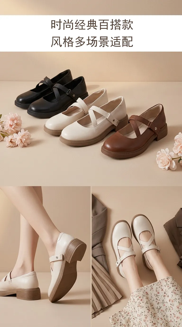 画面:竖版9:16构图,画面顶部预留标题文案空白区域,上半部分是米白、黑色、棕色3色玛丽珍鞋,错落摆放在浅咖色背景上,搭配浅粉色花艺点缀;下半部分是真人上脚双角度特写,上脚特写搭配不同风格穿搭,分别适配校园百褶裙、约会连衣裙,突出全场景百搭属性,多色鞋子摆放整齐,色彩统一不杂乱,突出上脚显脚小、显腿直的效果,背景是极简奶咖色墙面,暖调柔光,突出全场景百搭属性。