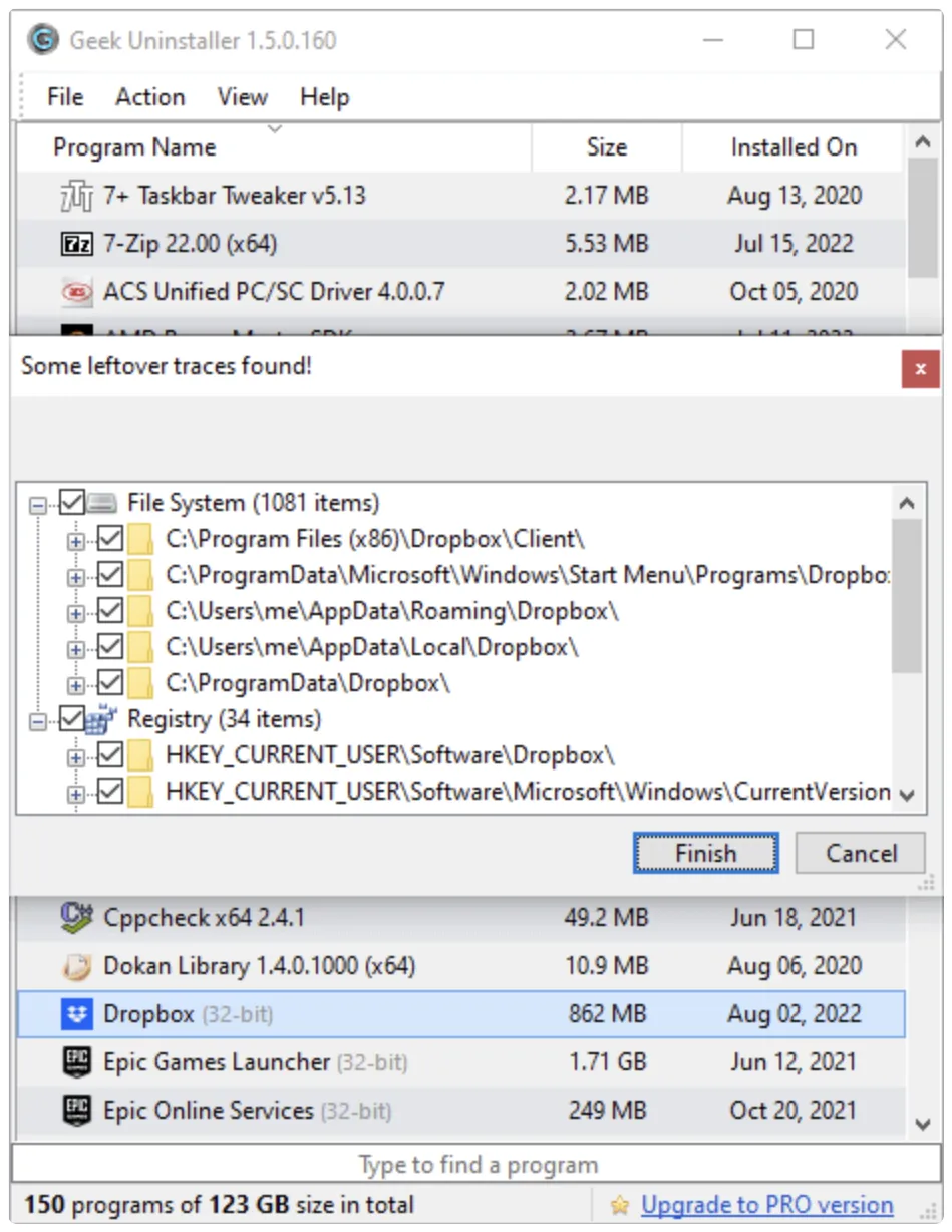 现在: Geek卸载完软件后,自动弹出残留扫描结果,列出所有遗留文件和注册表项,勾选要删的,点完成就行。